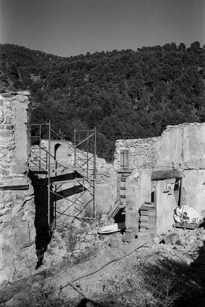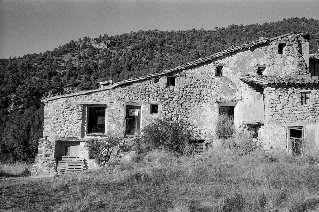 During that mid-week pause I treated myself to a new lens. I had been using 50mm almost exclusively for about two years, and while I had been really pleased with a lot of the work I’ve made in that time, I also didn’t want to get too stuck in my ways. A little change of perspective was another new challenge I wanted to give myself, learning to compose and fill a slightly wider frame. I’ll probably write more about this when I have a bit more visual material from further rolls. For now, it’s on to the first roll and a half which were taken in and around Los Cerezos in rural Teruel. Los Cerezos itself has around a hundred registered residents, and the nearby hamlets of Paraíso Bajo and Paraíso Alto are now officially deserted. Paraíso Bajo still attracts a few returning families in summer, but Paraíso Alto has been abandoned since the 1970s. Electricity never reached the settlement, in fact the road that now takes you there was only constructed for forestry purposes after the last residents had packed up and left after a succession of hard winters. They would have left the village as they always had, following the path of the river on foot.